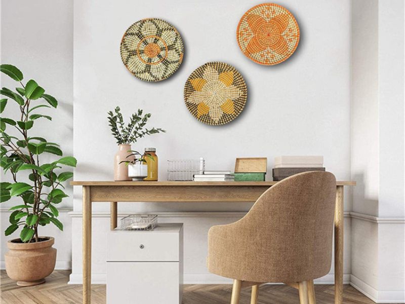 Decoração de parede com cestas circulares oferece estilo equilibrado e versátil. Seu design simétrico complementa espaços ecléticos ou monocromáticos, adicionando calor e harmonia visual.